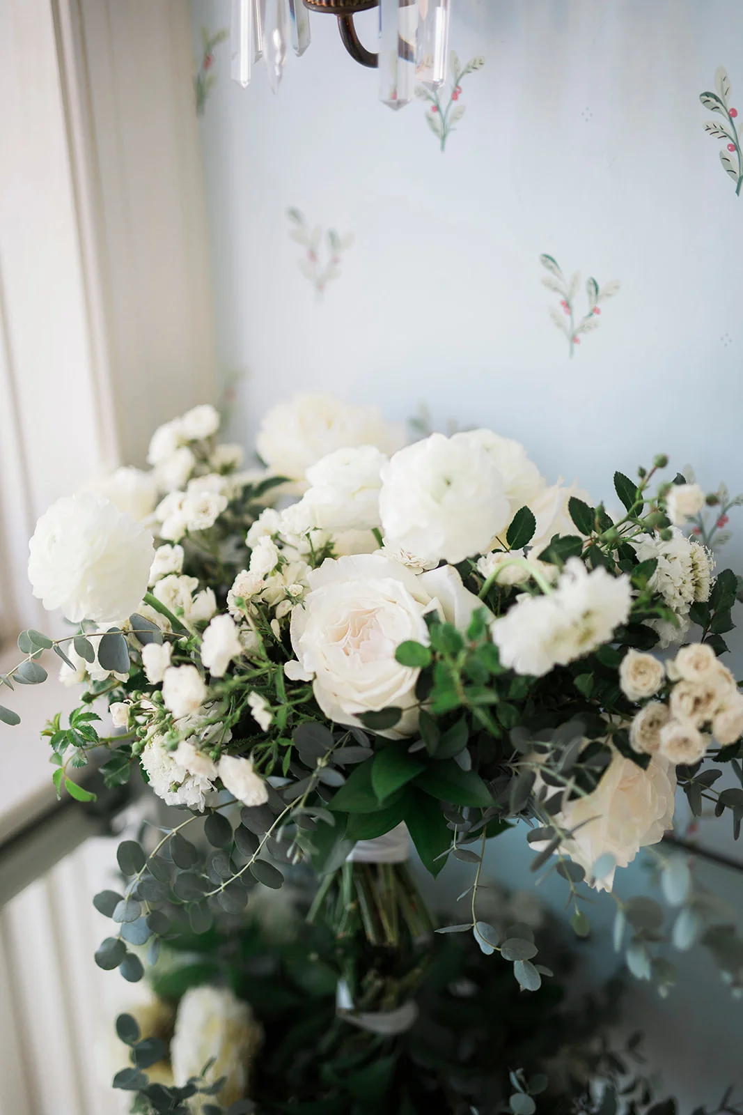 White bridal bouquet, rose, ranunculus, fern, eucalyptus | Darlington House, La Jolla | Compass Floral | Wedding Florist in San Diego and Southern California | My Sun and Stars Co. Photography